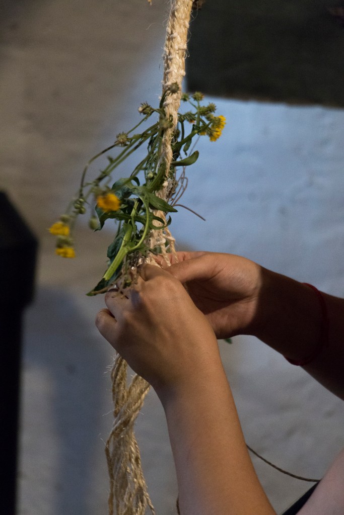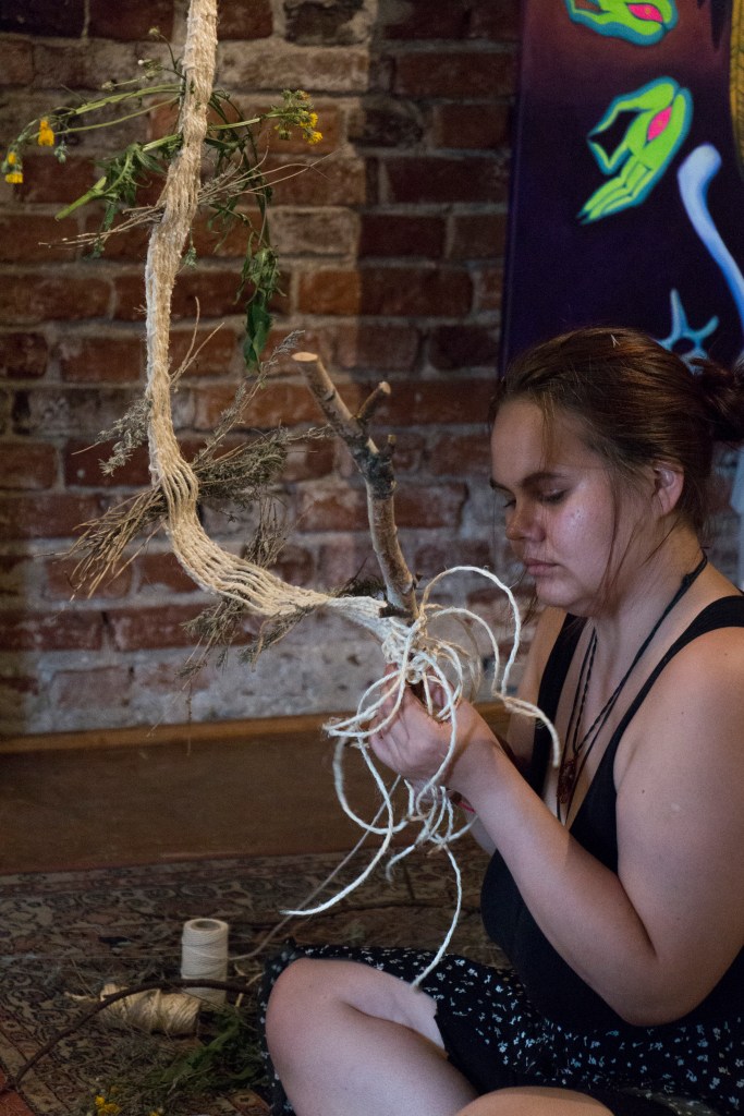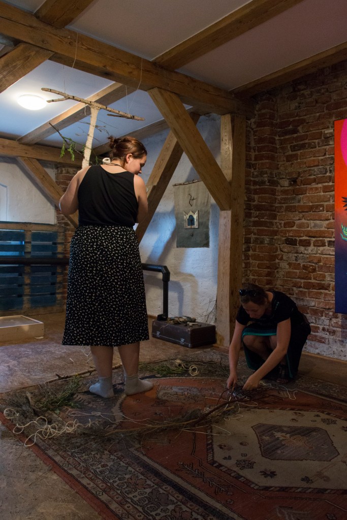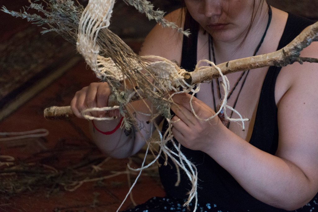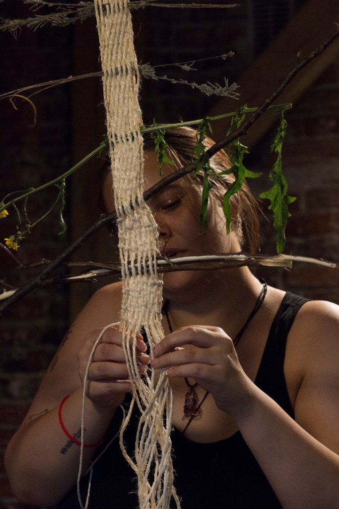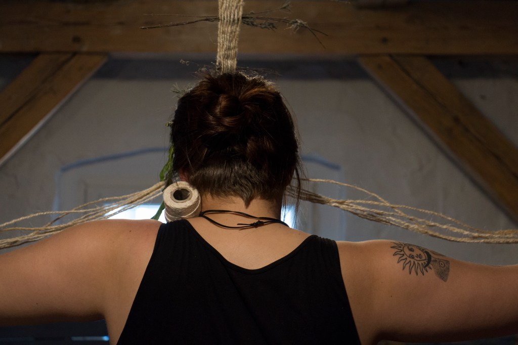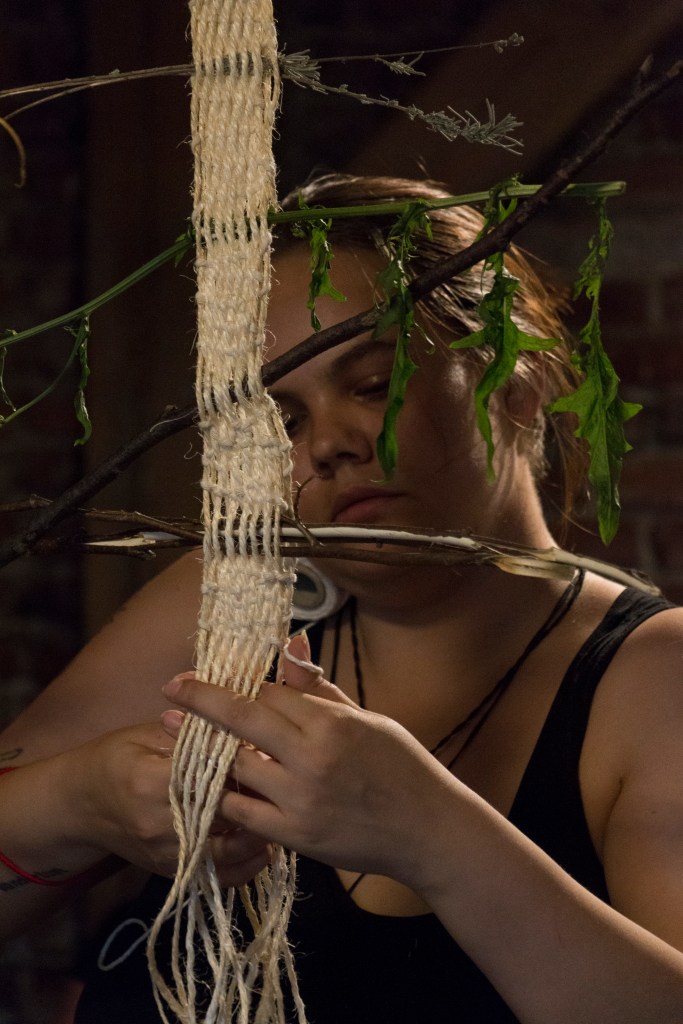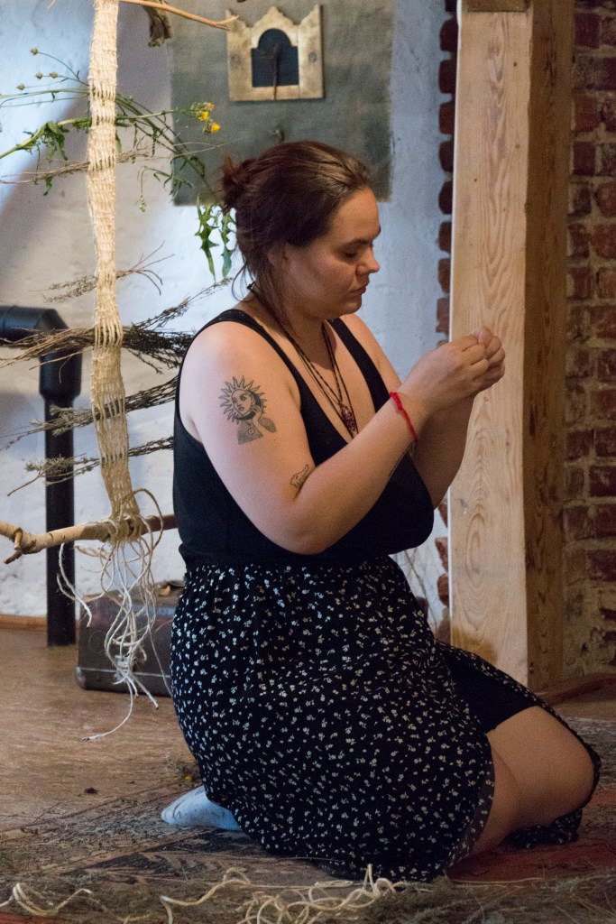 „Yearning” is a multi-threaded story about a world I long for. In the act of weaving, I connect with the memory of my grandmother and reconcile with my family heritage; at the same time, the fabric tells a story of the world I wish to create – in harmony with nature and the community from whom I seek help during the weaving process. This teaches me what is needed for healing – when I finish braiding, I sew the tear in the inherited skirt with the red thread of fate.